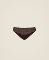 Slip aus Festonspitze mit floralem Dessin und Mikrofaser-Charmeuse mit elastischem Taillenbund mit Bogenrand, Organzaschleife und Logoherz aus Metall hinten in der Mitte.