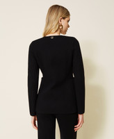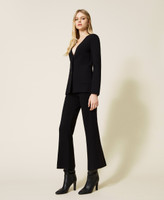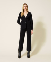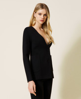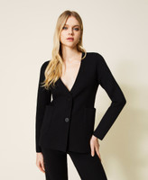 Blazer aus Viskose-Stretch-Gestrick mit tiefem V-Ausschnitt, Schulterpolstern, Knopfverschluss und aufgesetzten Taschen.