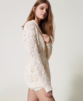 Langer Cardigan aus Baumwollmischung mit Lochmustern, die ein Rautenmuster entstehen lassen. Das Modell hat einen Schalkragen, lange Ärmel, einen Verschluss mit passendem Gürtel, gerippte Bündchen mit Bogenrand und einen lockeren Schnitt.