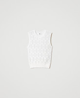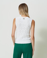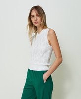Rundhalstop aus Viskose-Stretch-Gestrick mit plastischem geometrischem Allover-Motiv im gleichen Farbton und gerippten Bündchen.