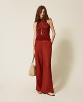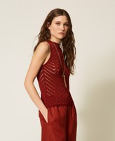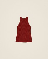 In Italien gefertigtes Oberteil aus Stretch-Viskose im großformatigen Zickzack-Muster mit See-through-Effekt und frei spielenden Fadenakzenten. Figurbetontes Modell mit Rundhalsausschnitt und Ärmelausschnitt mit Neckholder-Effekt.