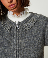 Kurzweste aus der Actitude Revive Collection aus Bouclé-Recyclinggarn mit Lurex (50 % recycelter Polyester). Das locker geschnittene Modell wird am Rundhalsausschnitt von Fransen verziert und ist mit einem Metallreißverschluss an der Vorderpartie und einem Metall-Logo an der Rückseite versehen. Das Modell gehört zum Conscious Program „Revive“ von Actitude by Twinset.
