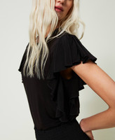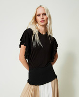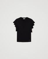 Ein Passepartout für zahllose Stilvariationen. Dieses T-Shirt aus elastischem Viskosejersey mit rundem Halsschnitt besticht durch seine kurzen Flügelärmel mit Volant und Keil innen an der Ärmelunterseite. Dazu kommt ein „Oval T“-Logo aus Metall. Ein Muss für Casual-Looks und auch elegante Outfits.