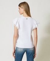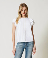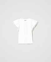 Gerade geschnittenes T-Shirt aus Baumwolljersey mit kurzen, gerafften Ärmeln und Spitzenbesatz.