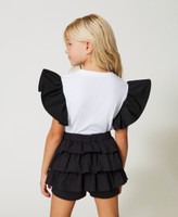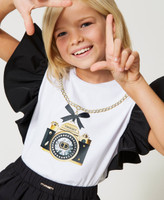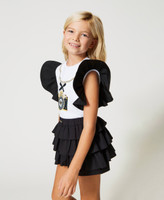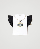 T-Shirt aus elastischem Baumwolljersey mit gerüschten Flügelärmeln aus Taft und Printmotiv an der Vorderpartie mit Strass und Nieten.