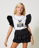 Wenn Sie ein originelles Mädchen-T-Shirt suchen, das sich auch für besondere Anlässe eignet, müssen Sie nicht weitersuchen: Dieses Modell aus elastischem Baumwolljersey sticht hervor durch seine gerüschten Flügelärmel aus Taft und das Printmotiv an der Vorderseite mit Strass- und Nietenapplikation. Genauso perfekt zu eleganten Röcken wie zu Jeans und legeren Hosen.