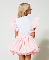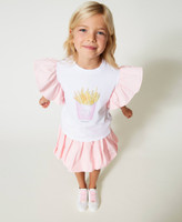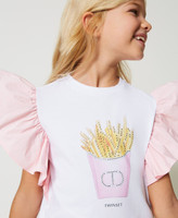 T-Shirt aus elastischem Baumwolljersey mit gerüschten Flügelärmeln aus Taft und Printmotiv an der Vorderpartie mit Strass und Nieten.