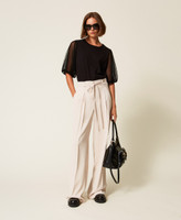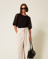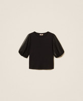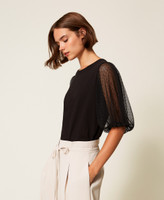 Gerade geschnittenes T-Shirt aus Baumwolljersey mit kurzen Ärmeln aus Plumetis-Tüll, Rundhalsausschnitt und der „Oval T“-Logo-Plakette auf der Rückseite.