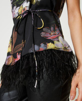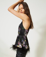 Kurzes Twilltop mit Blumenprint, schmalen Trägern, Federn an der Unterpartie und amerikanischem Rückenausschnitt.
