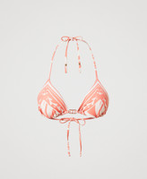 Triangel-Bikinitop mit Foulardprint, einem Exklusivmotiv von Twinset, und „Oval T“-Logo aus goldfarbenem Metall mit farbiger Emaillierung in der Mitte. Das mit herausnehmbaren Cup-Einlagen wattierte Modell mit einfarbigem Futter ist außerdem mit Schnüren ausgestattet, die man entweder am Nacken binden oder dank der an den Enden angebrachten Schlaufen auch als Träger nutzen kann.