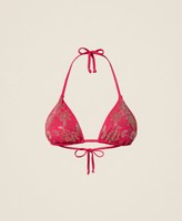 Triangel-Bikinitop mit floraler Hotfix-Nietenapplikation. Wattiertes Modell mit herausnehmbaren Cup-Einlagen, Bindeverschluss am Nacken und Schleifenverschluss hinten.