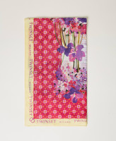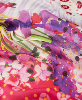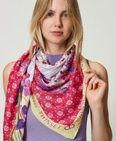 Tuch aus Modalgewebe mit bunten Printmotiven mit Tupfen, Blumen und Kontrastlogos.