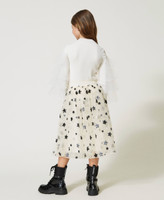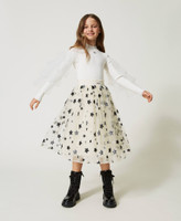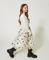 Dieser knielange Mädchenrock aus hauchzartem Tüll ist mit edlen Sternen bestickt, einige davon aus metallgrauen oder schwarzen Pailletten, andere aus Fadenstickereien. Das mit Jersey gefütterte Modell mit weitem Volumen ist am elastischen Taillenbund gerafft. Ein Hauch Poesie und Glamour, der sich perfekt für Hochzeiten und andere Feste eignet.