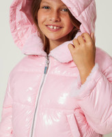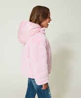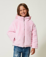 Wendesteppjacke mit einer Seite aus glänzendem technischem Gewebe, zweiter Seite aus Pelzimitat und farblich abgestimmtem Sticklogo.