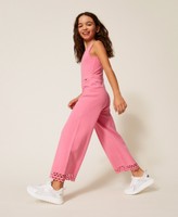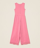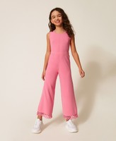 Girls’ viscose blend openwork knit jumpsuit with a zig-zag pattern at the hem. Crew neck, scalloped trims, metal logo plate at the front, straight fit.