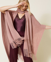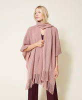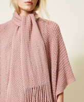 Openwork knit poncho, pussy bow with sash, fringed hem and logo plate.