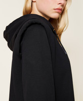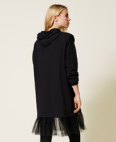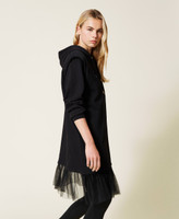 Plush fabric short dress with double tulle flounce, hood, embroidered logo in front, long sleeves.