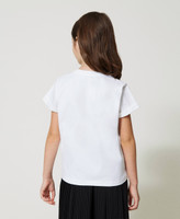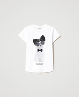 Stretch cotton jersey regular-shirt with photo print, appliquéd rhinestones and studs, folded short sleeves.