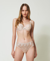 Push-up bra made from animal print tulle with floral thread embroidery. Padded with removable cups, cleavage with scalloped lace trim with ecru thread embroidery, underwire, adjustable elastic and satin straps with scalloped lace at the front, two-hook fastening, metal heart logo with satin and lace bow between the cups.