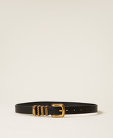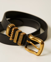 Low waist belt with square buckle and metal loops with different details, light brass.