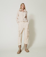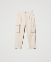 Actitude collection cargo trousers made from warm feel polished cotton with asymmetric side pockets. Front pleats, zip and button fastening, slant pockets, loose fit.
