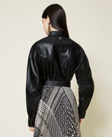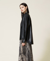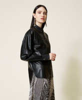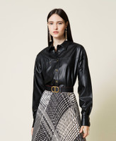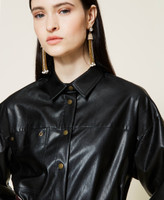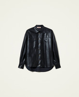Light coated fabric shirt with appliquéd pockets, snap button closure, asymmetric hem.