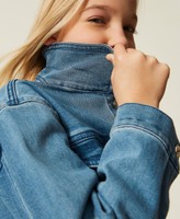 Girls' stretch denim cropped jacket with logo snap buttons. Shirt collar, long sleeves with buttoned cuffs, yoke, faux pocket flaps with button, matching stitching, lace label with logo embroidery on the back, medium wash, straight fit.