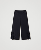 Up-to-date and sophisticated design. Wide leg cropped poplin trousers with tonal ruffle at the hem and side zip closure. The perfect base for your desk-to-dinner looks.