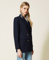Double-breasted blazer made from stretch wool blend twill with decorated metal buttons, lining.