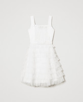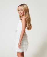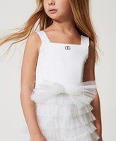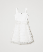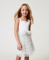 Girls' dress with double duchesse top and skirt with multi-layered tulle flounces. Straight neckline, wide shoulder straps, concealed side zip fastening, smocking on the back, jersey lining, slightly flared. Removable duchesse belt with tulle bow, elastic and snap buttons at the back. This dress is perfect for a formal occasion.