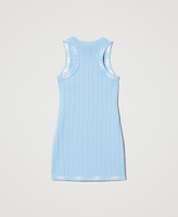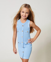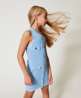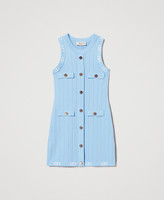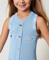 Girls' short wide-ribbed viscose blend knit dress with jacquard Oval T trims. Sleeveless, crew neck, mock gold-tone front button fastening, fitted.
