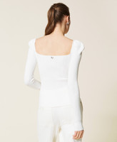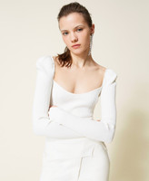 Always flattering, this fitted ribbed technical viscose jumper with gathered shoulders, wide neckline, shaping stitches in front, long sleeves, slits at the bottom. A timeless garment you can wear with anything.