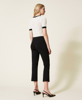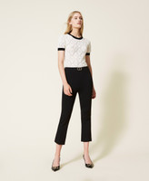 Don’ t miss out these flared fit, stretch Milano stitch cropped trousers, with metal Oval T logo at the waist. Zip and hook side closure and permanent crease. They will be your versatile solution for personalised looks.