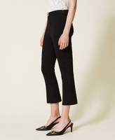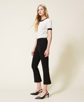 Stretch Milano stitch cropped, flared trousers with metal logo at the waist, side zip.