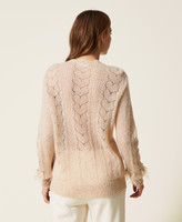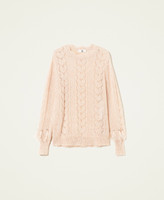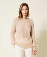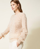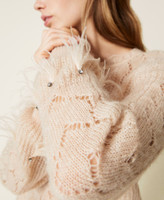 Wide wool blend jumper with mixed knitwork on front and back, crew neck, long sleeves with feathers and rhinestones.