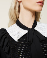 Effortless elegance for every day. Short plain knit cotton dress with punched insert in the bodice, button opening, long sleeves with ruffle at the cuff, loose fitting. Wear with or without the contrasting collar with pussy bow.