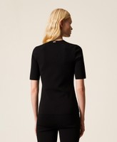 Stretch viscose knit jacket with gold-tone buttons. Mandarin collar, short sleeves, front fastening, side flaps, fitted.