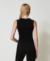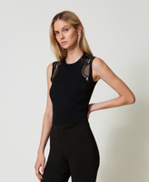 Rib knit top made from viscose blend crêpe with inlaid macramé lace on the shoulders, round neck, sleeveless, Oval T logo plate at the back, fitted.