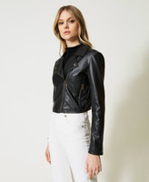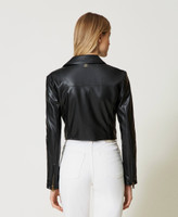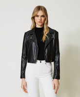 Twinset presents the plongé nappa-like biker jacket with double-breasted closure with zip, welt pockets, long sleeves with zip, metal buttons with Oval T logo, lining. The perfect outerwear for all your looks this season.
