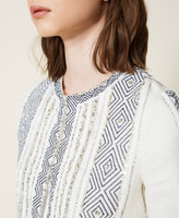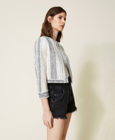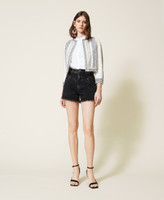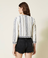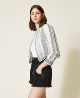 Complete your looks with the effortless elegance of this linen blend Mandarin collar jacket with lurex thread, handmade embroidery made with thread, sequins and mother-of-pearl studs: a Twinset-exclusive design. Round neck, three-quarter sleeves, small inner hook closure, cotton muslin lining and Oval T logo on the back. Match it with coordinated shorts for a sophisticated set, perfect for special occasions.