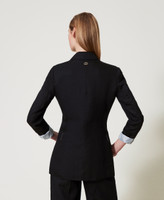 Linen and TENCEL(TM) blend blazer with slanted construction and comfortable hand feel. Pointy collar lapels, covered button fastening, long sleeves with shoulder pads, pleats that emphasise the waist, welt pockets with flaps, Oval T logo plate on the back, striped silk lining, straight fit. This item is part of the “Archive” range, inspired by the most iconic and most loved garments from the Twinset collections. The viscose used for this item (57% Viscose) generates lower emissions and uses less water than average viscose.