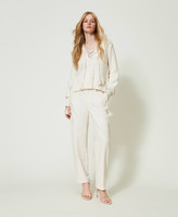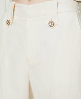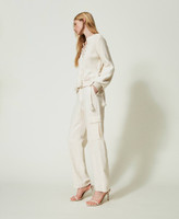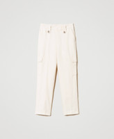 Cotton and linen twill cargo trousers with pointy belt loops in front, metal buttons with Oval T, patch pockets on the sides.