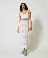 Actitude collection linen and cotton long dress with plain knit bodice, thin shoulder straps and punched fabric skirt with floral motif.