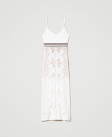 Effortless elegance that gets you noticed. Linen and cotton long dress with thin straps, plain knit bodice, technical yarn striped band, punched fabric skirt with floral motif, nude-tone lining. Wear it with high heels or flats, depending on the mood.