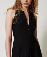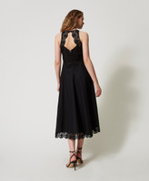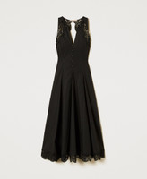 Long dress in stretch cotton poplin with macramé lace inlaid along the raglan edge on the front and back and appliquéd with a scalloped edge at the hem. Featuring a round neck with V-opening and covered buttons, a seamed waist, pleated skirt, side zip fastening and Oval T logo tab on the back. Unlined with a loose fit.