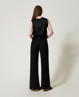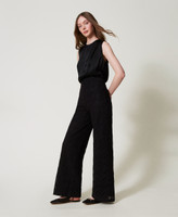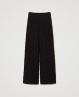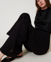 Macramé lace trousers with geometric pattern, high waist, side zip fastening, Oval T logo plate at the back, cotton muslin lining, wide fit.