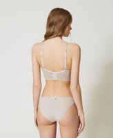 To enhance your curves with unique style, opt for this tulle bustier with macramé embroidery, non-padded underwired cups, adjustable double straps in front that are made from logo elastic on the back, scalloped hem, doubled tulle sides with stays, four-hook rear closure. Irresistible with Brazilian briefs made from the same fabric.