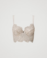 Non-padded underwired bustier made from tulle with macramé embroidery, adjustable shoulder straps, side stays.