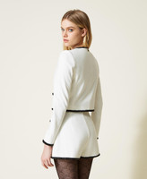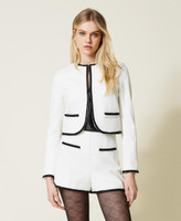 Contemporary bon-ton for this short Mandarin collar jacket made from viscose blend stretch Milano stitch, with a trim of handmade embroidery over tulle along the edges featuring iron ore-tone crystal beads refracting the light. Straight fit, slightly padded shoulders, welt pockets, juxtaposed closure with covered hooks, Oval T plate on the back and lining. Wear it with its matching shorts to create a brand new style of trouser suit.