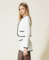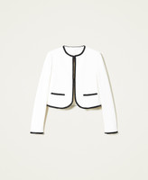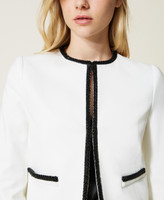 Stretch Milano Stitch Mandarin collar jacket with contrasting trim with handmade crystal bead embroidery, hook closure.